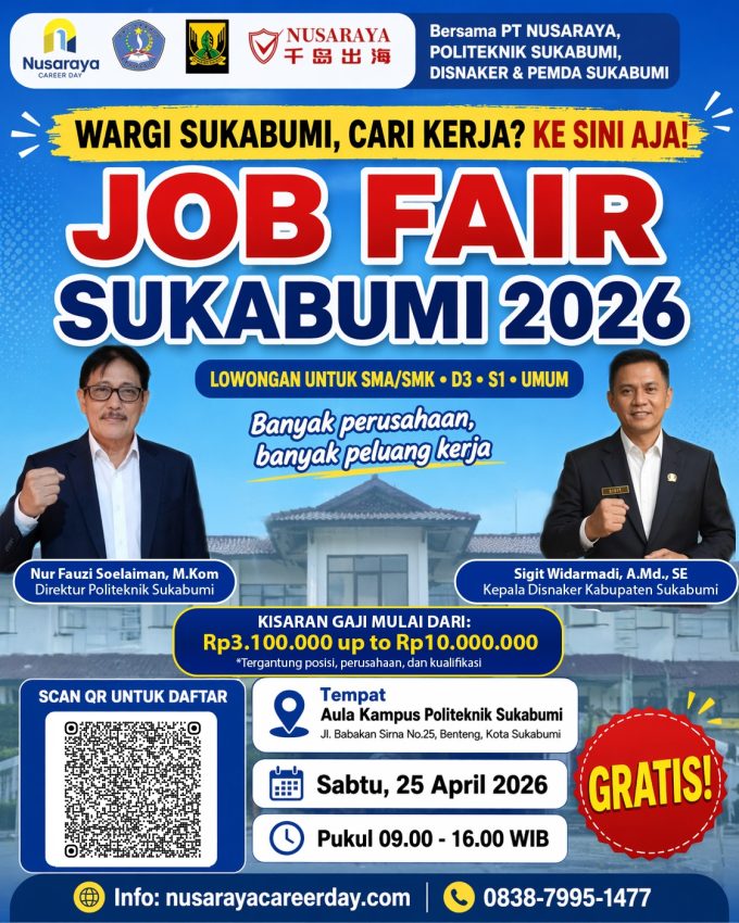Job fair ini merupakan hasil kolaborasi antara Dinas Tenaga Kerja Kabupaten Sukabumi, PT Nusaraya, dan Politeknik Sukabumi. Kegiatan akan dilaksanakan di Aula Kampus Politeknik Sukabumi pada Sabtu, 25 April 2026, mulai pukul 09.00 hingga 16.00 WIB.