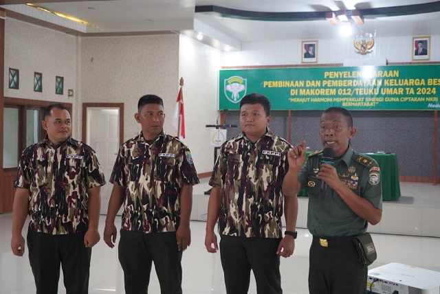 SINARPAGINEWS.COM,MEULABOH – Korem 012/TU menggelar kegiatan pembinaan dan pemberdayaan Keluarga Besar TNI (KBT) pada Kamis (14/11/2024) di Aula Bhakti Gara Makorem 012/TU, Desa Ujong Tanoh Darat, Kec. Johan Pahlawan, Kab Aceh Barat. Kegiatan ini bertujuan mempererat silaturahmi dan meningkatkan peran KBT, khususnya FKPPI, dalam mendukung tugas-tugas TNI dan program pembangunan nasional.