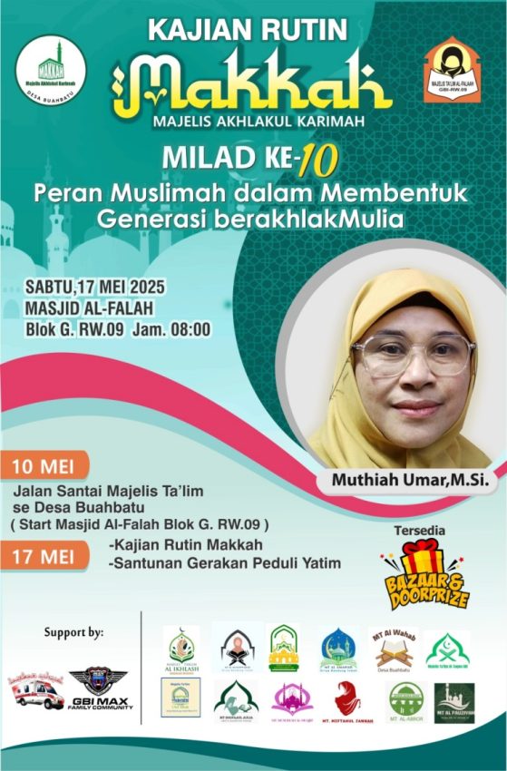 “Insya Allah pada hari Sabtu (10/5/20) dari jam 07.00 Wib – 11.00 Wib, kami akan melaksanakan Lomba Jalan Santai untuk pertama kalinya dalam rangka Milad Makkah ke-10. Ini sudah termasuk sebagian dari program kerja yaitu untuk meningkatkan kesehatan. Yang kedua perbuatan Bilhal yaitu mencontohkan perbuatan yang baik dengan busana muslimah dan berbagai macam model muslimah yang syari’i. Sehingga itu bisa dicontoh oleh anak-anak generasi selanjutnya,” kata Ustazah Nur Syamsiah di GBI, Kamis (8/5/2025) sore.