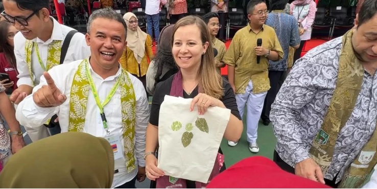 Di hadapan para tamu kehormatan, para siswa menampilkan beragam karya kreatif yang memadukan kearifan lokal dengan sentuhan global. Salah satunya melalui kegiatan eco print, yakni teknik mencetak motif daun pada goodie bag yang sarat nilai edukatif dan ramah lingkungan.
